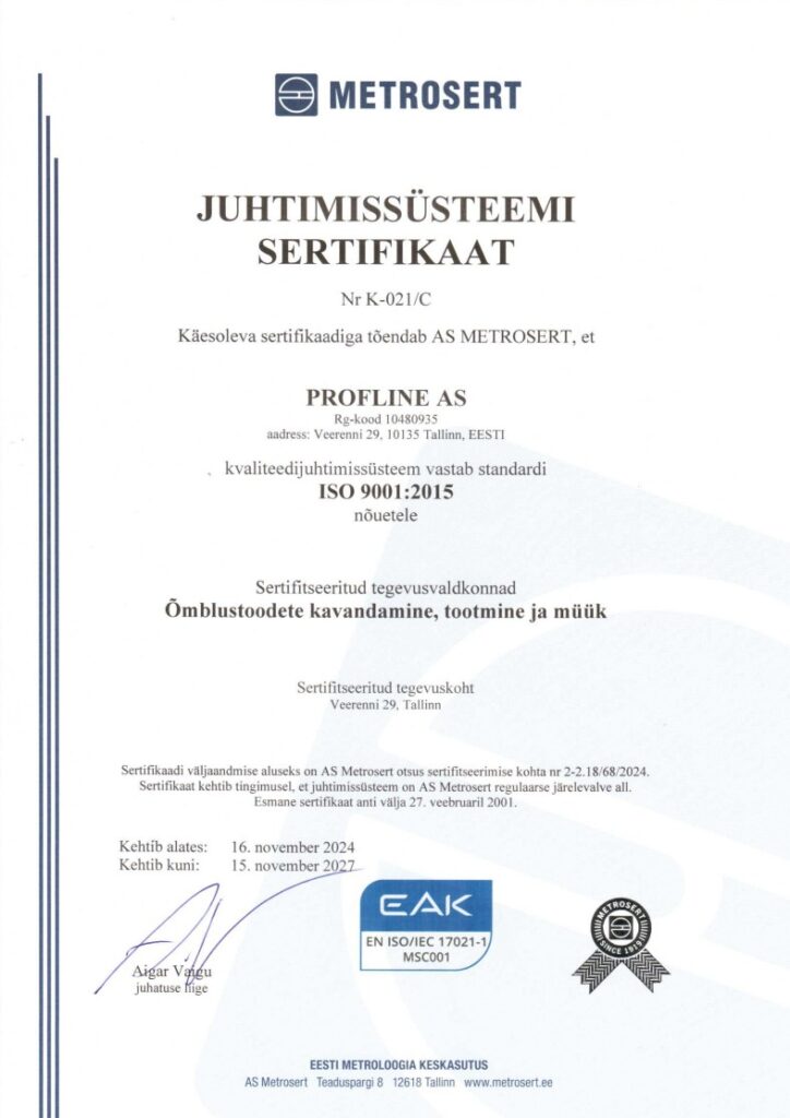 • ISO 9001 Kvaliteedijuhtimissüsteem